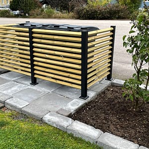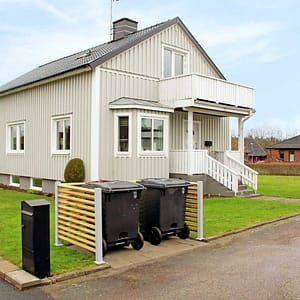 Med fem stykker Drömminge-stolper inklusiv tilbehør bygger du nemt et skraldespandsskjuler, der gemmer dine skraldespande væk. Stolperne, som er 102 cm høje, kombineres med 45×45 mm trælægter. Trælægterne købes separat i byggemarkedet, hvilket gør det nemt for dig at sætte dit eget præg på affaldsskuret. Bredden på affaldsskuret bestemmer du selv, men det anbefalede mål mellem stolperne er ca. 1,50 meter, maks 1,8 m.