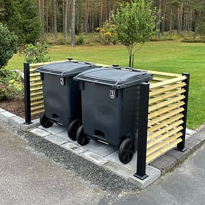 Med fem stykker Drömminge-stolper inklusiv tilbehør bygger du nemt et skraldespandsskjuler, der gemmer dine skraldespande væk. Stolperne, som er 102 cm høje, kombineres med 45×45 mm trælægter. Trælægterne købes separat i byggemarkedet, hvilket gør det nemt for dig at sætte dit eget præg på affaldsskuret. Bredden på affaldsskuret bestemmer du selv, men det anbefalede mål mellem stolperne er ca. 1,50 meter, maks 1,8 m.