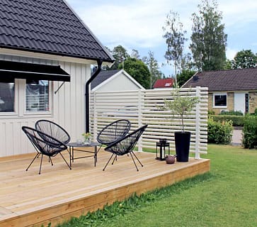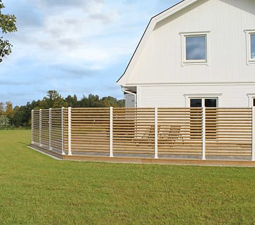 Du kombinerer Drömminge stolperne med 2-tommers (45x45 mm) trælister, som kan købes i enhver byggemarked. Trykimprægnerede trælister, laserede eller malede trælister, jernvitriol eller andre behandlinger - du vælger selv, hvordan dine trælister skal se ud, og derfor bliver hvert hegn unikt! Den vedligeholdelsesfrie struktur kombineret med trykimprægnerede trælister giver et vedligeholdelsesfrit hegn med lang levetid. Hullerne i Drömminge stolperne er drejet en kvart omgang, hvilket giver ekstra beskyttelse mod indsyn samt et unikt og karakteristisk udseende. Drömminge giver 75% privatlivs- og vindbeskyttelse.