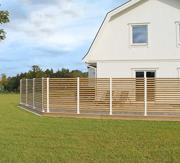 Du kombinerer Drömminge stolperne med 2-tommers (45x45 mm) trælister, som kan købes i enhver byggemarked. Trykimprægnerede trælister, laserede eller malede trælister, jernvitriol eller andre behandlinger - du vælger selv, hvordan dine trælister skal se ud, og derfor bliver hvert hegn unikt! Den vedligeholdelsesfrie struktur kombineret med trykimprægnerede trælister giver et vedligeholdelsesfrit hegn med lang levetid. Hullerne i Drömminge stolperne er drejet en kvart omgang, hvilket giver ekstra beskyttelse mod indsyn samt et unikt og karakteristisk udseende. Drömminge giver 75% privatlivs- og vindbeskyttelse.