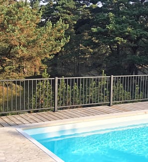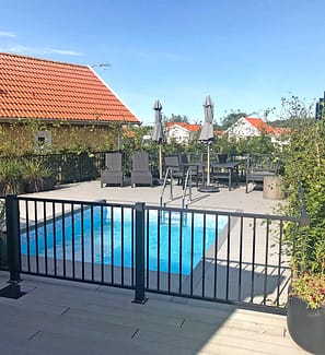 Herrestad hegn opfylder de krav, der er fastsat for et poolhegn. Hegnet er 90 cm højt, ikke-klatrevenligt, og afstanden forneden er også så lav, at børn ikke kan kravle under det.
