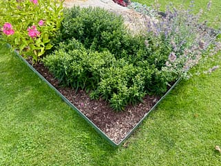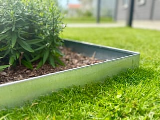 Vores høje bedkant er 18 cm høj og fremstillet i 1 mm galvaniseret plade. Pladen er dobbelt bukket i overkanten for ikke at være skarp at træde på. Bedkanterne samles med skrue og møtrik og er nemme at forme og bøje. Mindst halvdelen af bedkantens højde bør ligge under jord for at kanten skal blive så stabil som muligt.