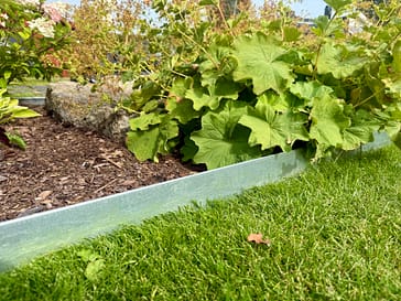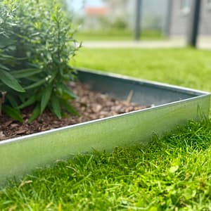 Vores høje bedkant er 18 cm høj og fremstillet i 1 mm galvaniseret plade. Pladen er dobbelt bukket i overkanten for ikke at være skarp at træde på. Bedkanterne samles med skrue og møtrik og er nemme at forme og bøje. Mindst halvdelen af bedkantens højde bør ligge under jord for at kanten skal blive så stabil som muligt.