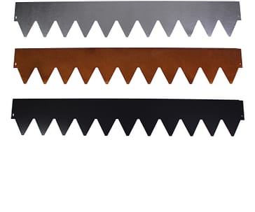 Bedkanterne findes i tre farver; galvaniseret, sort og vejrbestandig corten. Galvaniseret plade giver en god beskyttelse mod rust, og lakken er en vejrbestandig pulverlak til udendørs brug. Bedkanten i corten får sin rustne overflade først efter noget tid udendørs. Vi anbefaler, at den sortlakerede kant bøjes forsigtigt og ikke i skarpe 90 graders hjørner, da der ellers er risiko for, at malingen sprækker.