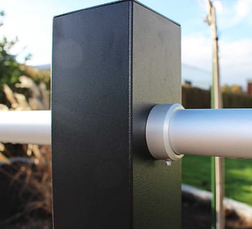 - Låsebeslagene trækkes på røret, som derefter skubbes ind i stolpen. Låsebeslaget skrues fast ved siden af stolpen og fungerer som en låsemekanisme, der sikrer røret.